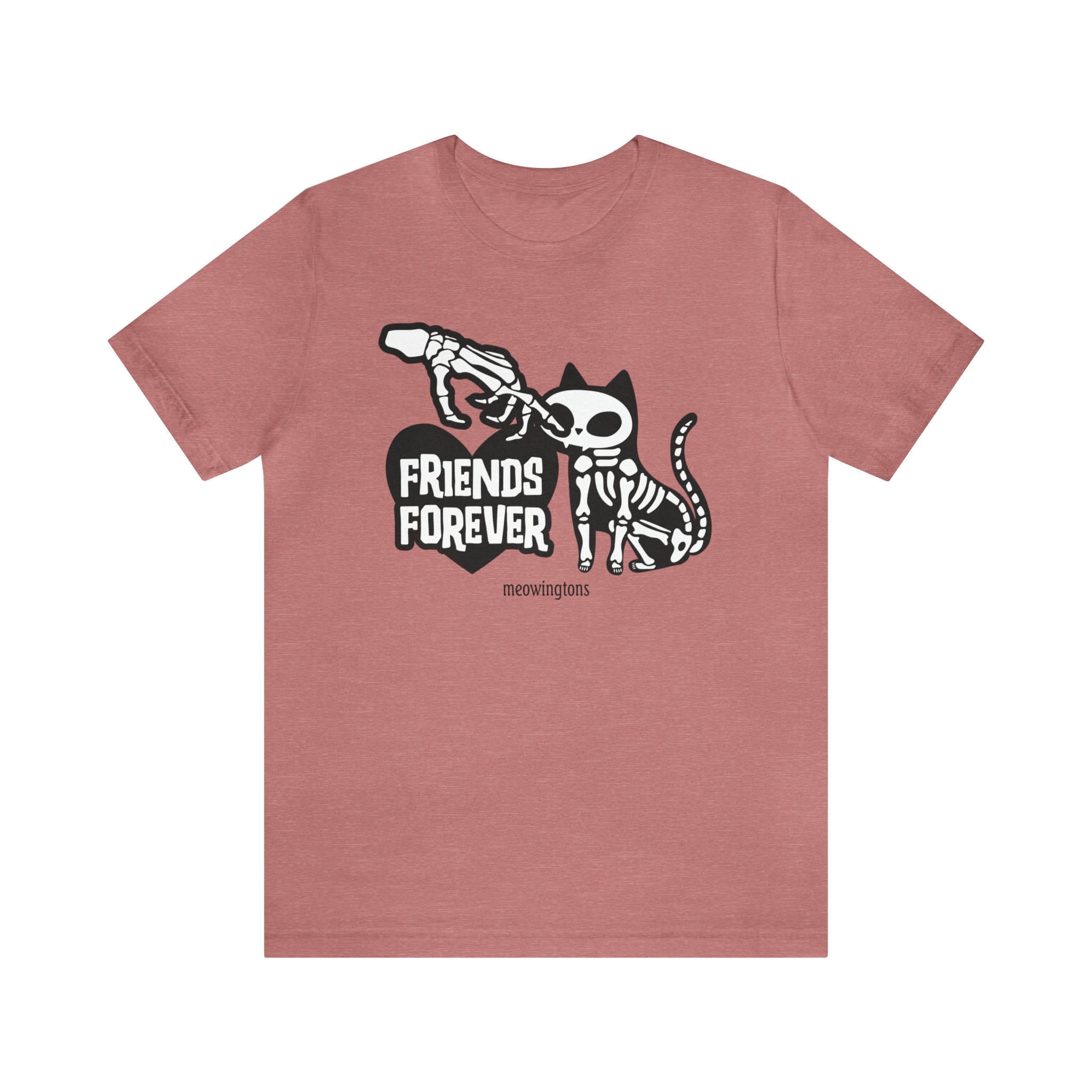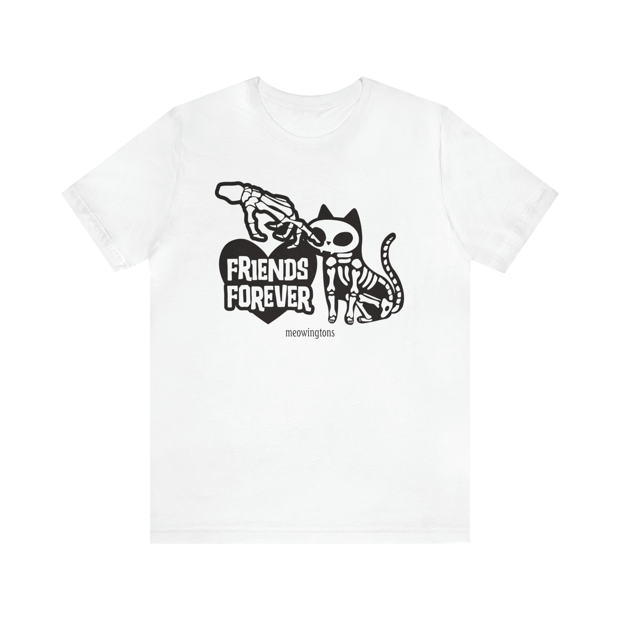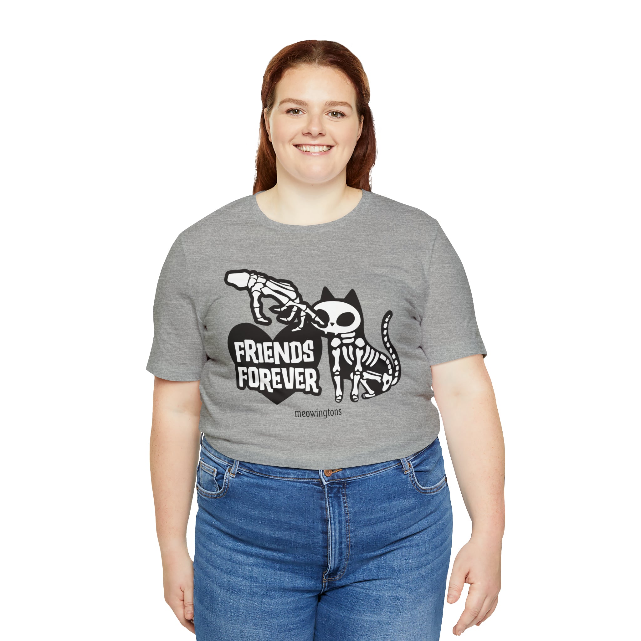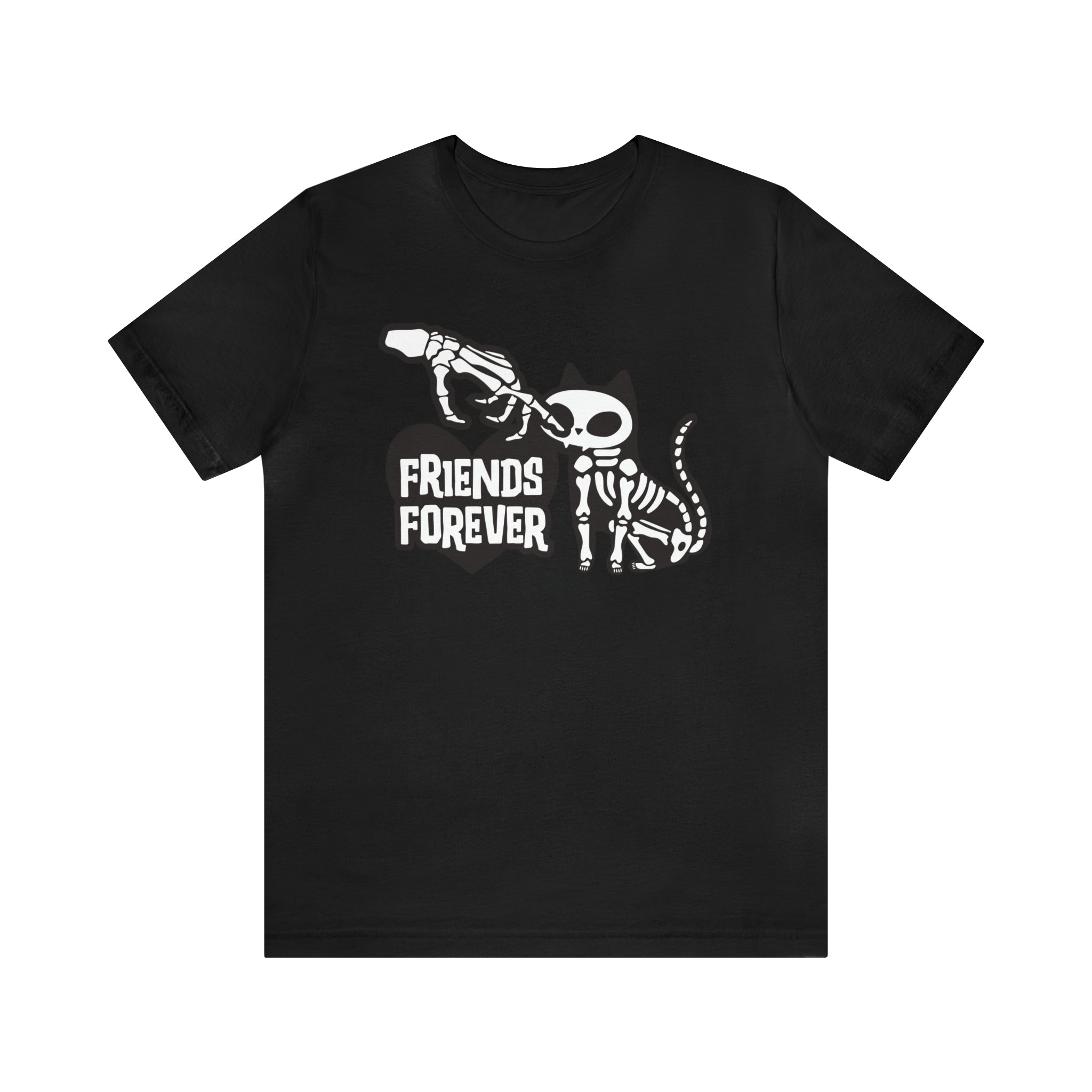 Who says skeletons can't have a soft side? This shirt features a cute and cuddly skeleton cat getting its nose booped by his best friend furever. It's a heartwarming reminder that even in the afterlife, friendships can be as strong as bone! "Friends Forever" is the motto, and it couldn't be truer.