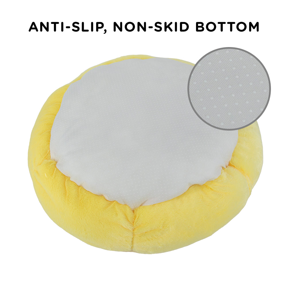 Crafted from silky soft vegan faux fur, your cat will feel as cozy as can be nestled in this adorable sunny cat bed. The bolstered sides (double as rays of the sun) offer extra support and a comfortable headrest. And when your pet sinks into the premium hypoallergenic poly-fill stuffing? The raised sides provide a comforting anti-anxiety "nest" for your pet to cuddle up in, be they a cat or small dog.