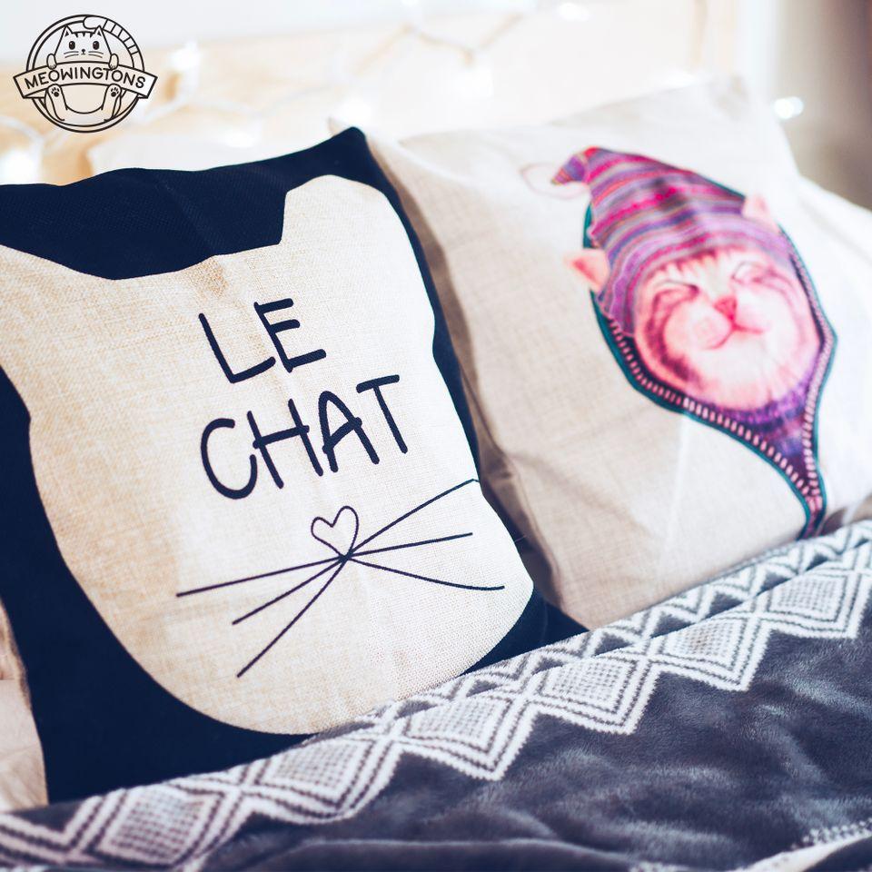 This cute toss pillow is off-white and black, with "Le Chat" printed on it. Although this little kitty is French - she still pronounces it "Meow". Whether you are looking to decorate your living room or bedroom, this pillow is a great way to add a little character to your furniture. What better way for us cat lovers to announce how much we love our furry little friends. Cozy up with your cat and rest your head on this comfy headrest.