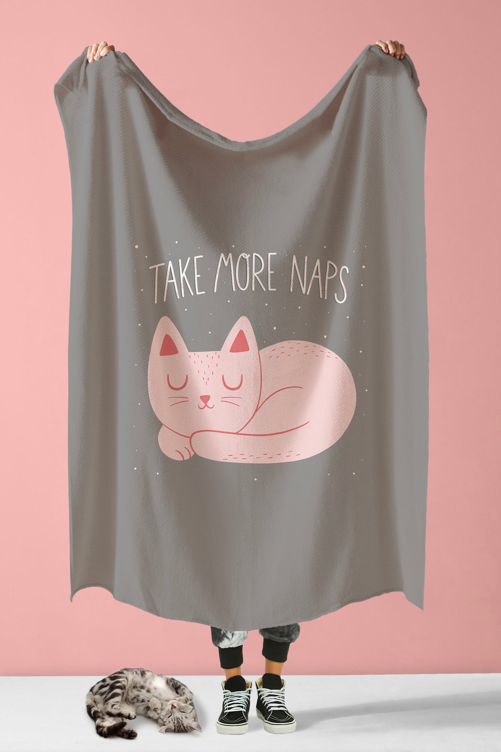 Ready for the ultimate nap experience? Look no further than the Take More Naps Sherpa Blanket! This cat print throw blanket features a pastel pink kitty curled up for a catnap and a whimsical text that reads, “Take More Naps.” Because here at Meowingtons, we know we have a lot to learn from our feline counterparts; including the need for more naps! The front of each blanket is made from 100% Polyester, and the reverse is lined with soft-to-the-touch, vegan Sherpa fleece for extra cozy comfort.