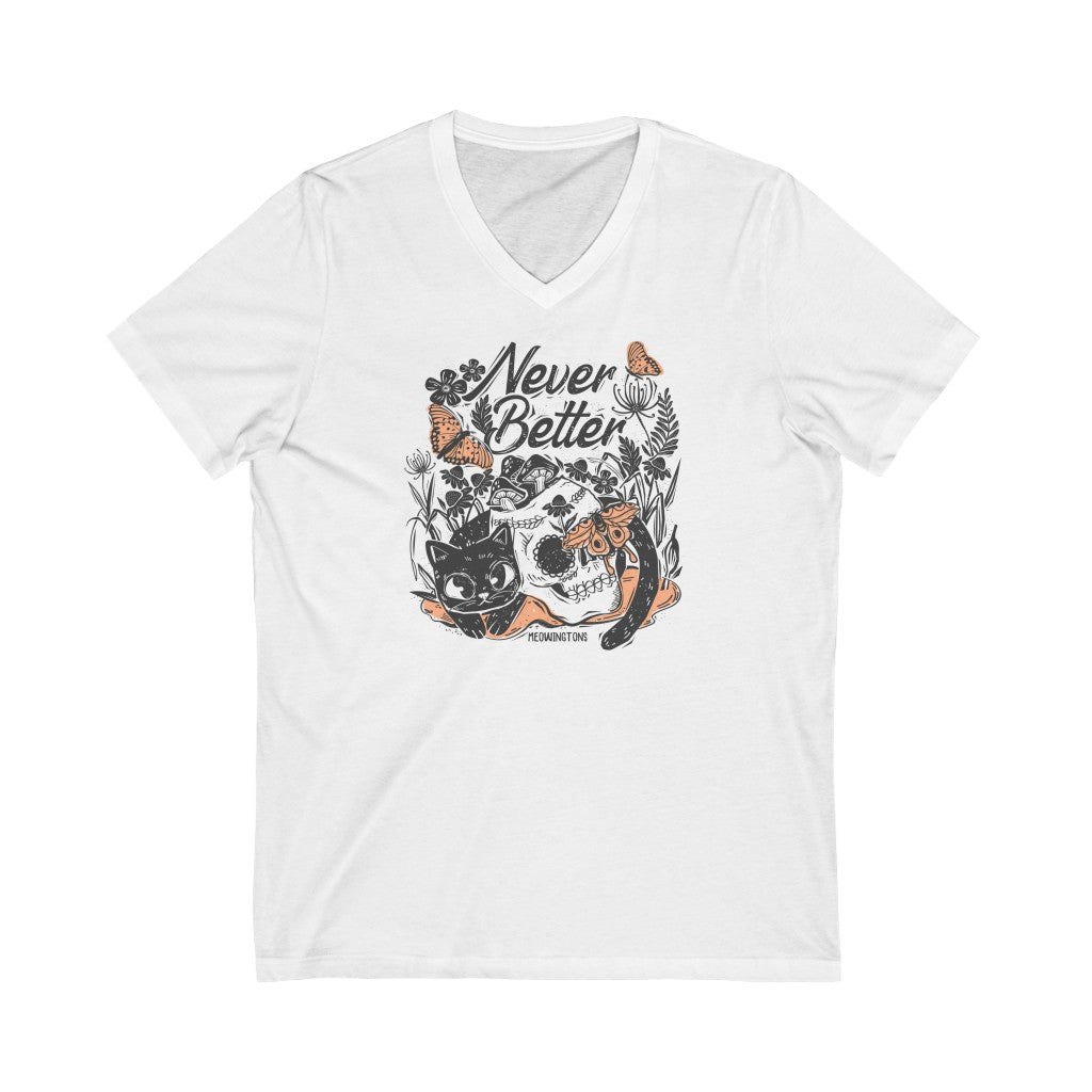 What options are available for the Never Better V-Neck Cat T-Shirt?