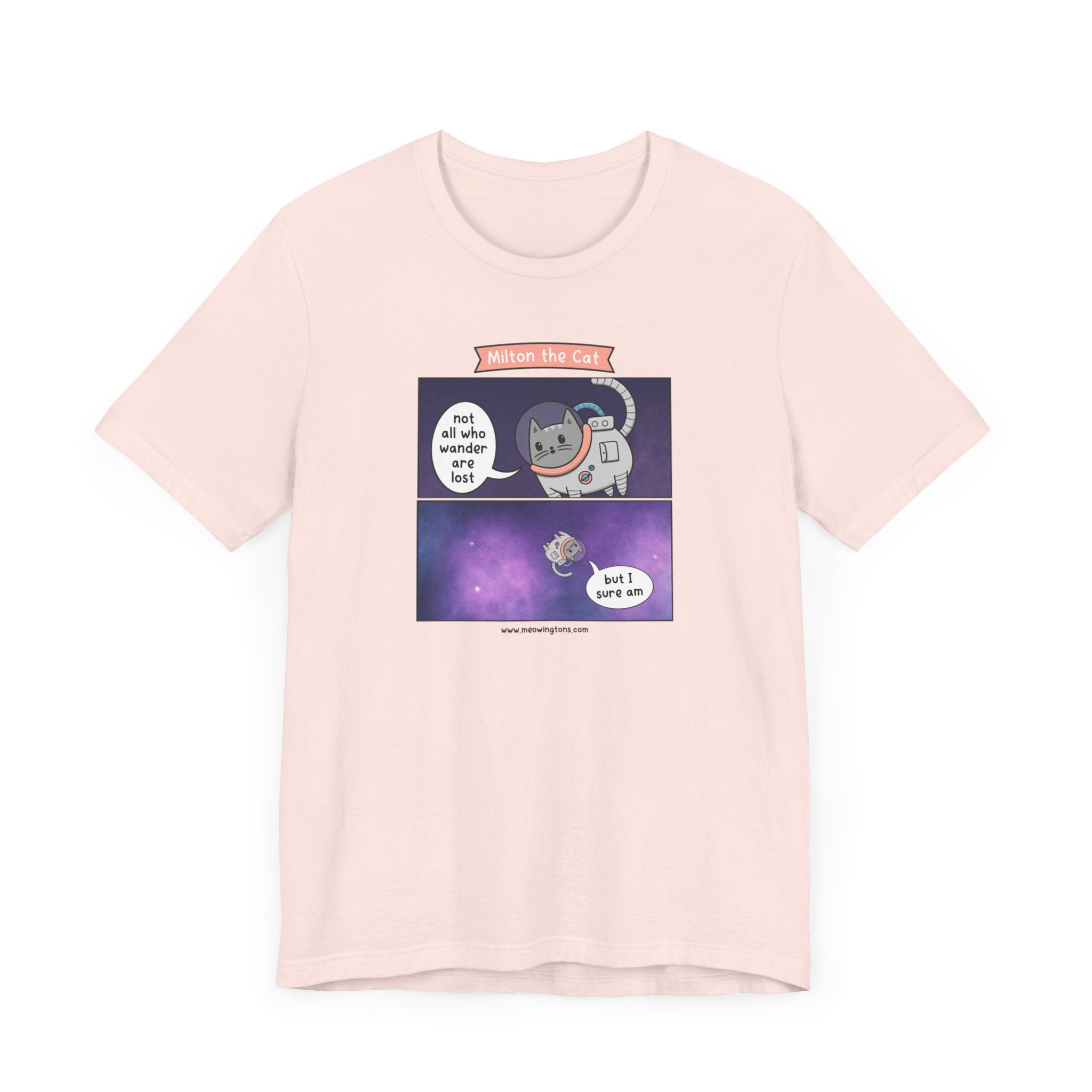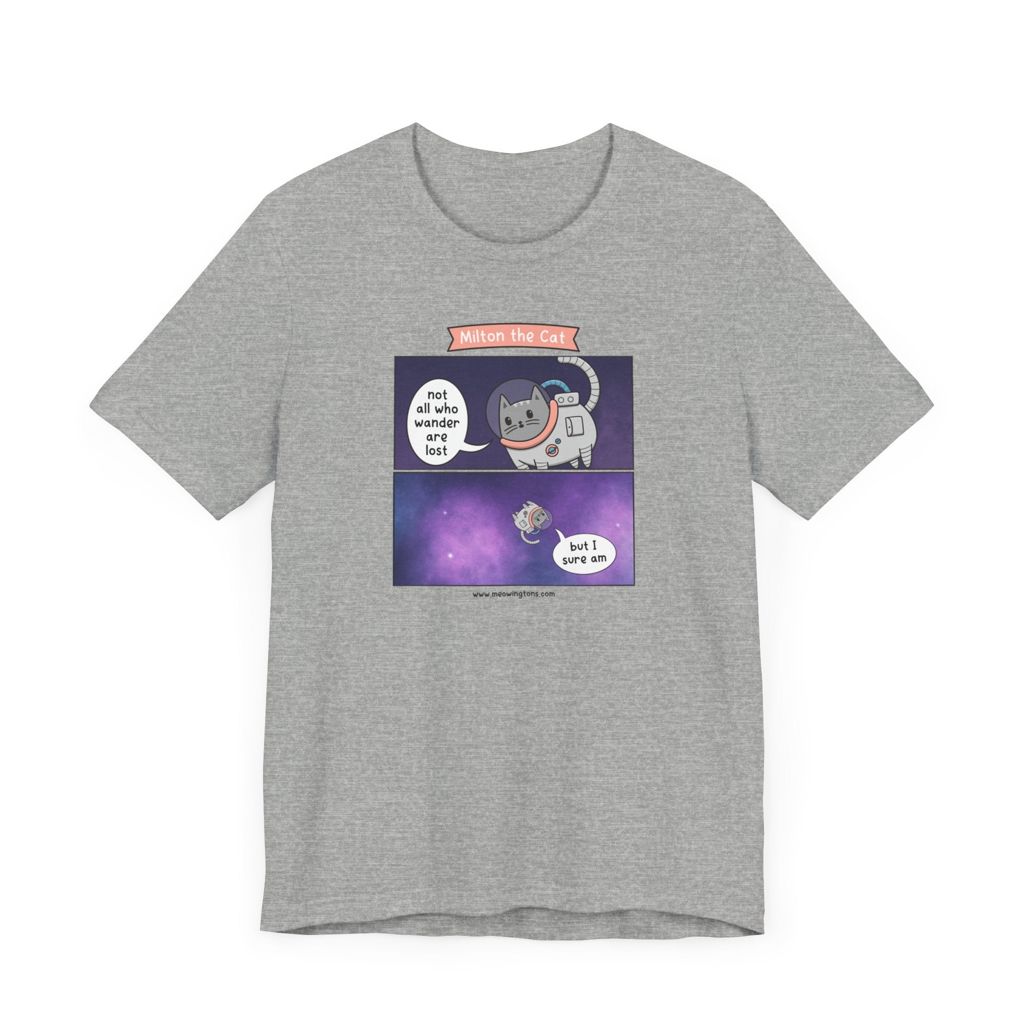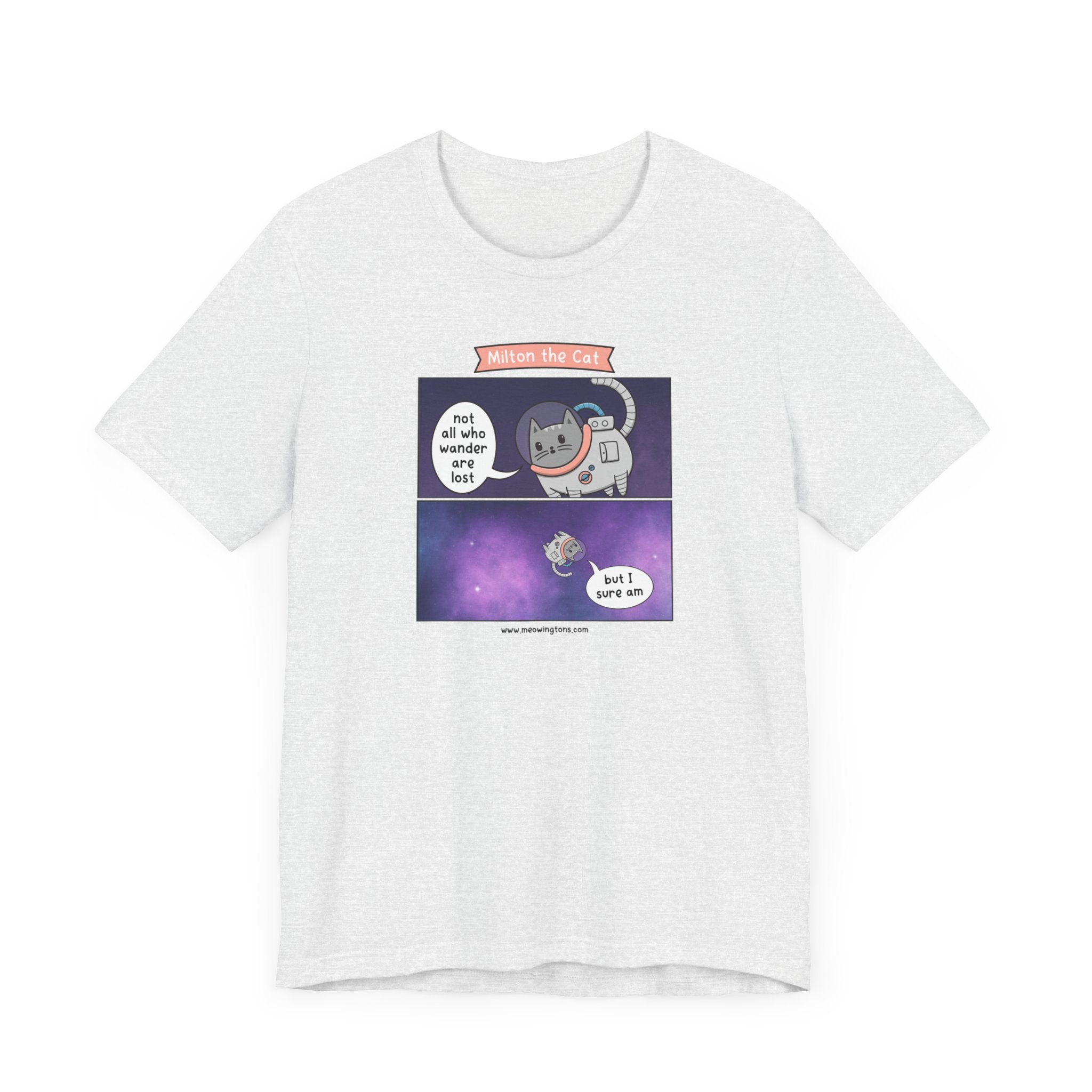 Whether you're lounging at home, running errands, or hanging out with friends, this versatile unisex tee is the purr-fect addition to any casual outfit. Featuring the quote "Not all who wander are lost, but I sure am," and a design that bursts with personality, the Not All Who Wander Comic T-Shirt is sure to become your new go-to favorite, especially for cat lovers of all ages.
