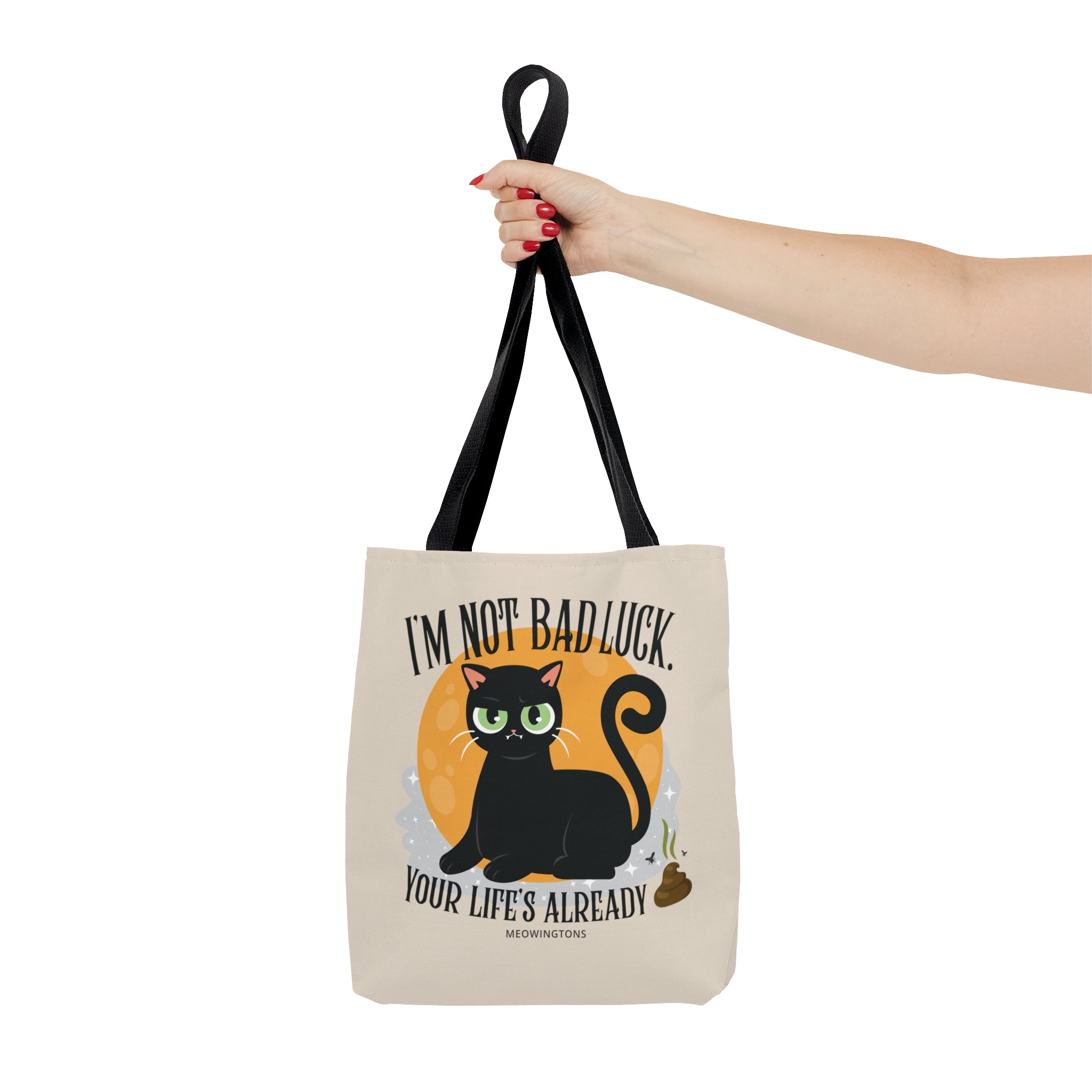Introducing our Black Cats Aren’t Bad Luck Tote Bag – the purr-fect blend of sass and style for this Halloween season! Have you ever met a cat with more attitude than a black cat under a full moon? This cat tote bag features a cheeky black cat silhouetted against a glowing moon, and it's here to set the record straight: Black cats aren't bad luck, your life was already shitty. With a sense of humor as sharp as their claws, this cat knows how to keep it real during Halloween (or any time of year). With its wide bottom and boxed corners and added stability, this tote will totes tote your tote-ables, whether it’s groceries, knitting supplies, or your ever-growing crystal collection on their way to charge under the full moon.