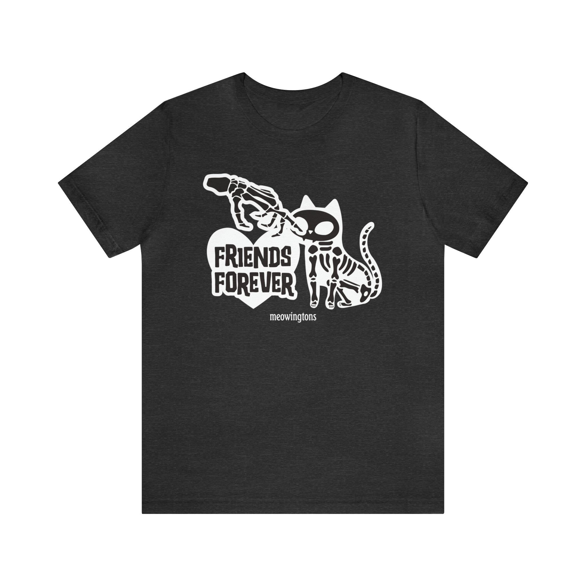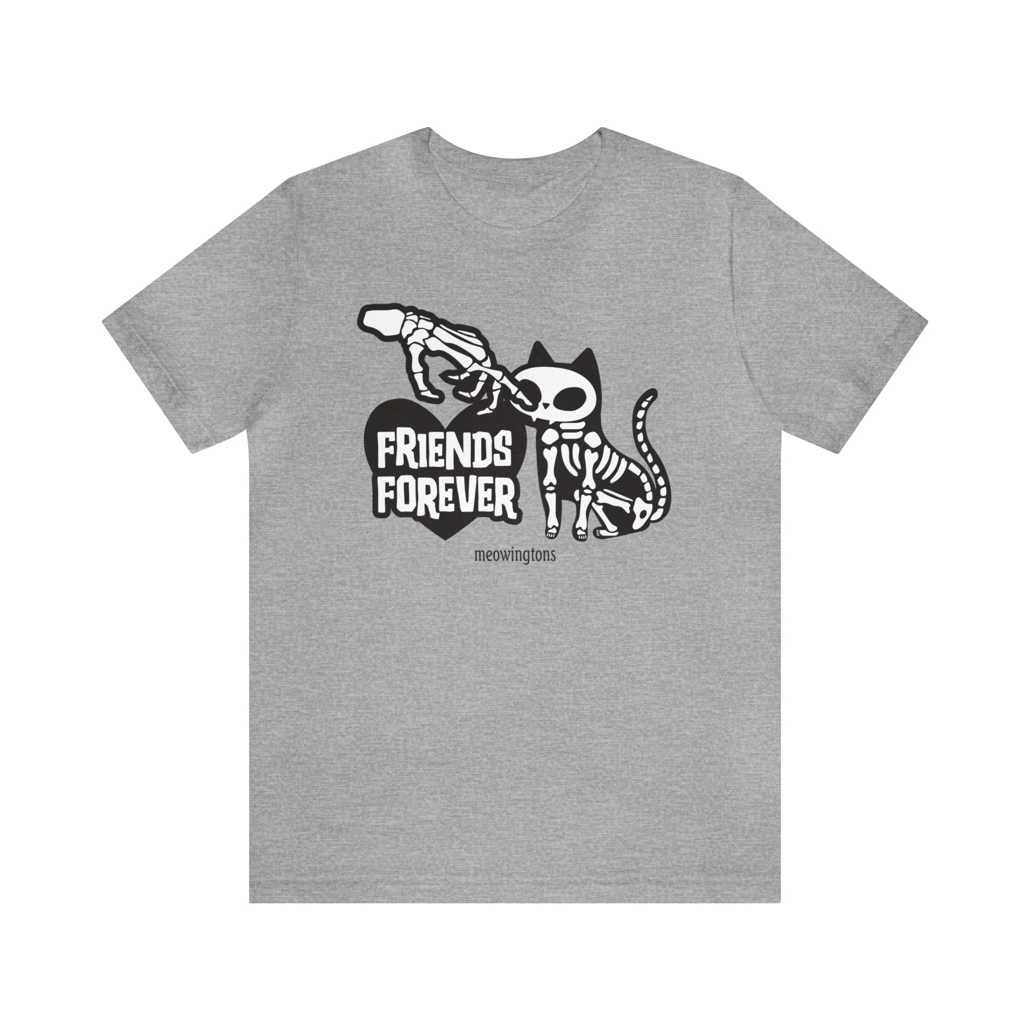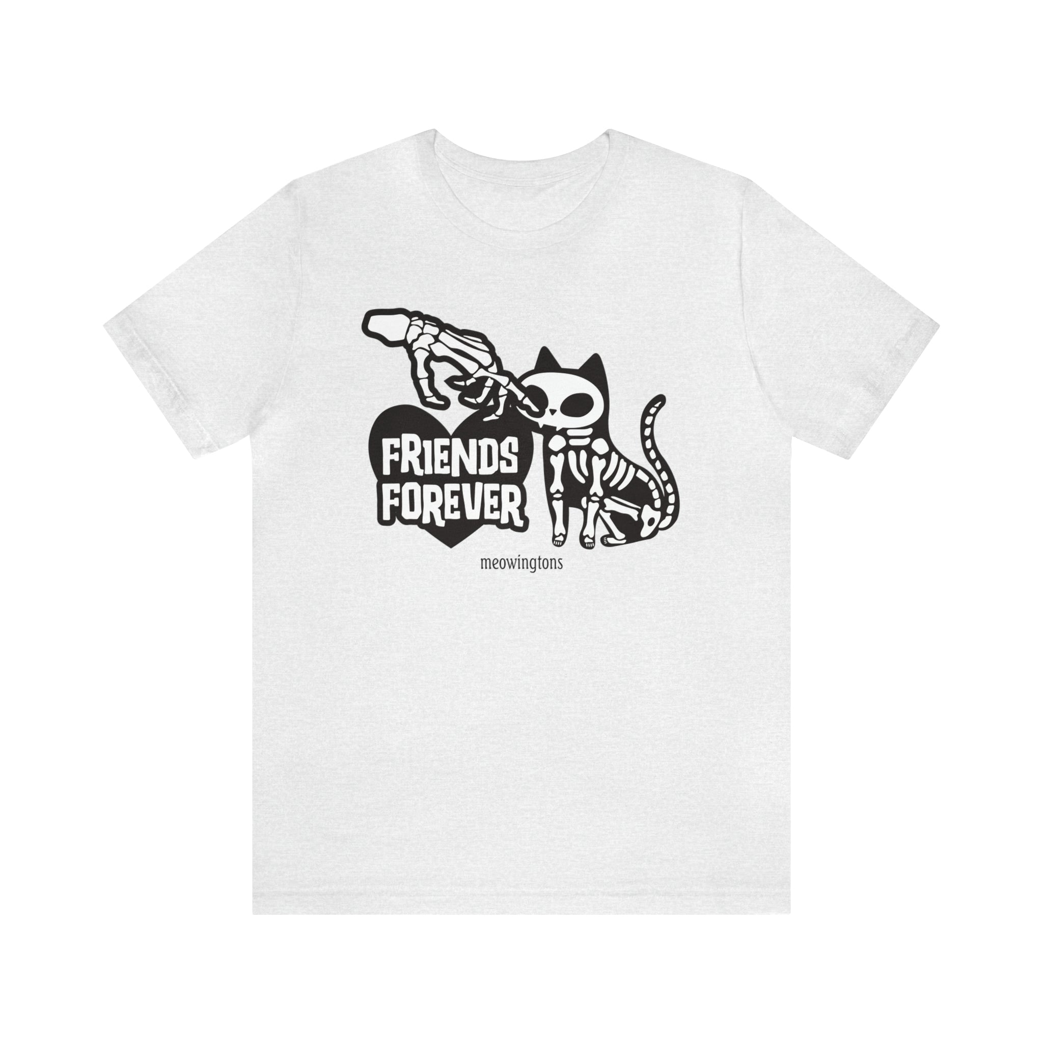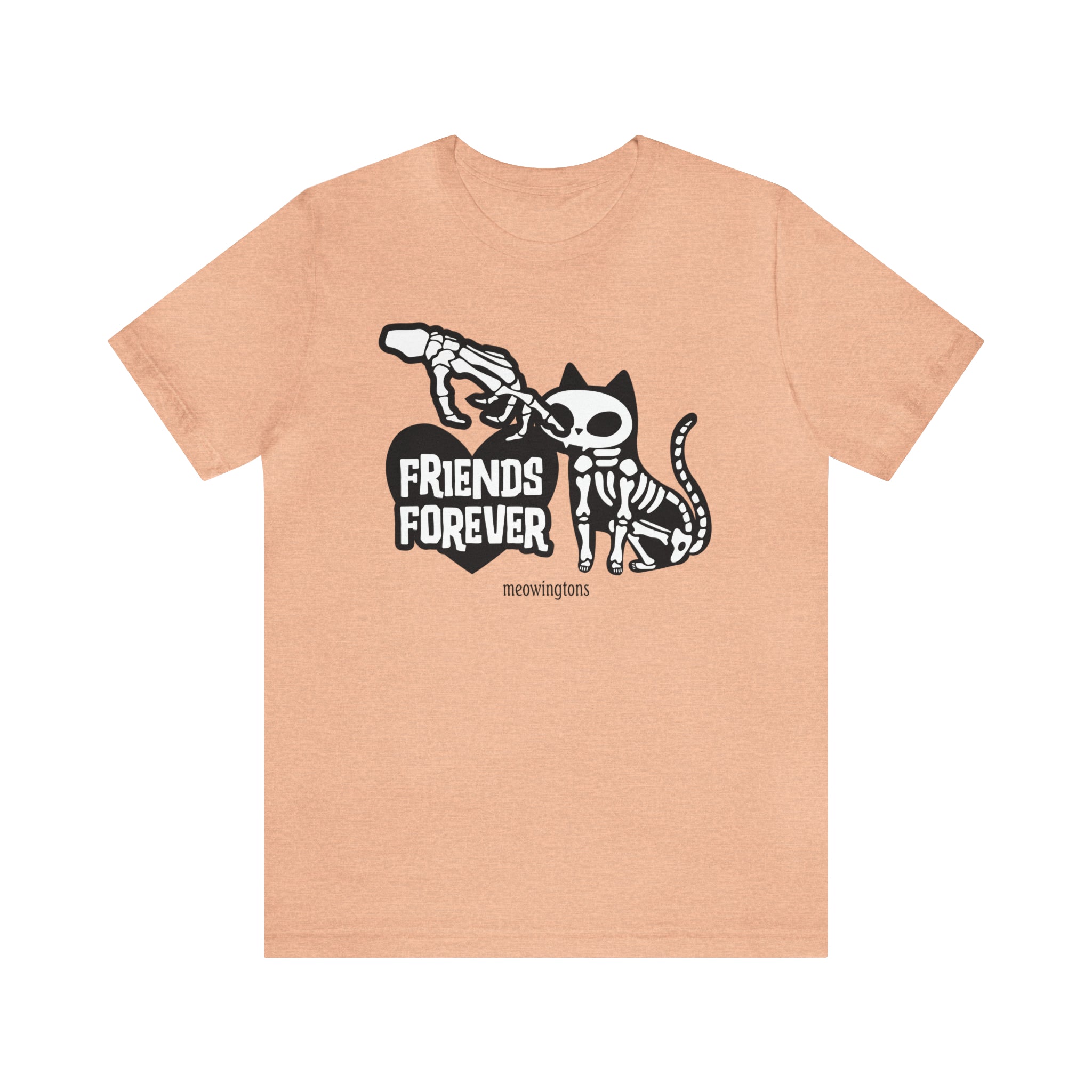 Who says skeletons can't have a soft side? This shirt features a cute and cuddly skeleton cat getting its nose booped by his best friend furever. It's a heartwarming reminder that even in the afterlife, friendships can be as strong as bone! "Friends Forever" is the motto, and it couldn't be truer.