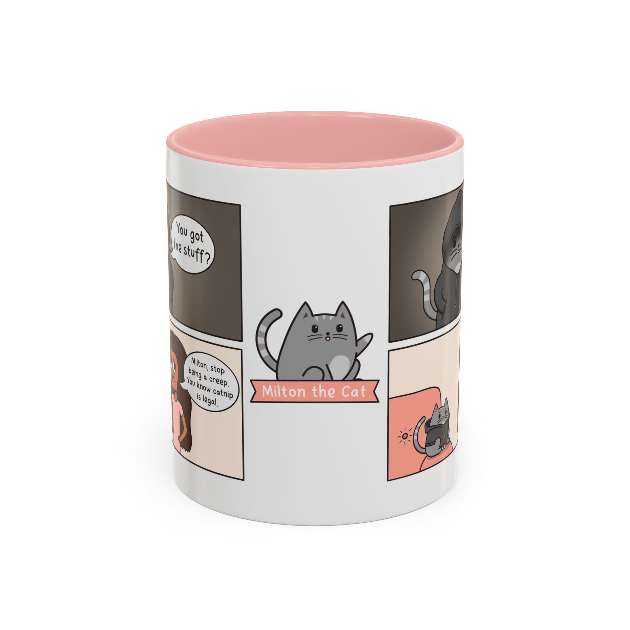 However, the true highlight of this mug is the enchanting comic strip featuring Milton making some sort of shady deal for that good, good leaf...you know, The Devil's Lettuce. The Kindest Bud... *wink wink* Meowijuana. THE C-A-T to the N-I-P!